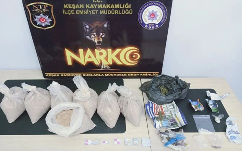 Edirne’nin Keşan ilçesinde bir adrese baskın düzenleyen polis, evde çok sayıda uyuşturucu madde ele geçirdi.