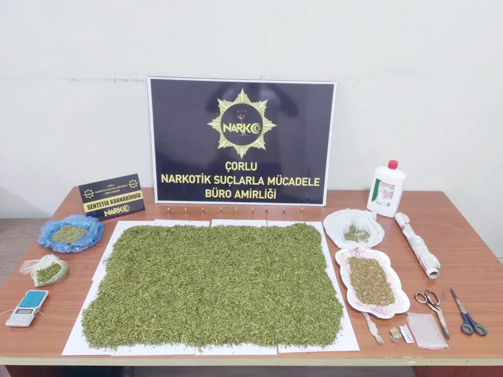 Tekirdağ İl Emniyet Müdürlüğü Narkotik Suçlarla Mücadele Şubesi ekiplerince Çorlu ve Ergene ilçelerinde 1 ikamet ve 1 işyeri adresine yönelik operasyon düzenlendi. Operasyonda yapılan aramalarda 578 gram sentetik kannobinoid maddesi, 1 adet hassas terazi, 9 adet 9x19 tabanca fişeği ele geçirildi.