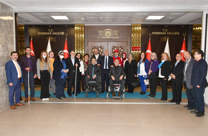 10-16 Mayıs Engelliler Haftası dolayısıyla Zihinsel Yetersiz Çocukları Yetiştirme ve Koruma Vakfı (ZİÇEV), Türkiye Sakatlar Derneği Tekirdağ Şubesi, Mavi Umut Derneği, Trakya Engelli Haklarını Koruma ve Geliştirme Derneği, Tekirdağ Otistik Çocukları Koruma Derneği, Mavi Martı Otizm Spor Kulübü, Süleymanpaşa Engelliler Kültür Yaşatma ve Farkındalık Derneği ve Süleymanpaşa Engelsiz Yaşam Derneği Üyeleri, Tekirdağ Aile ve Sosyal Hizmetler İl Müdürü Ülkü Uslu ile birlikte Vali Aziz Yıldırım’ı ziyaret etti.