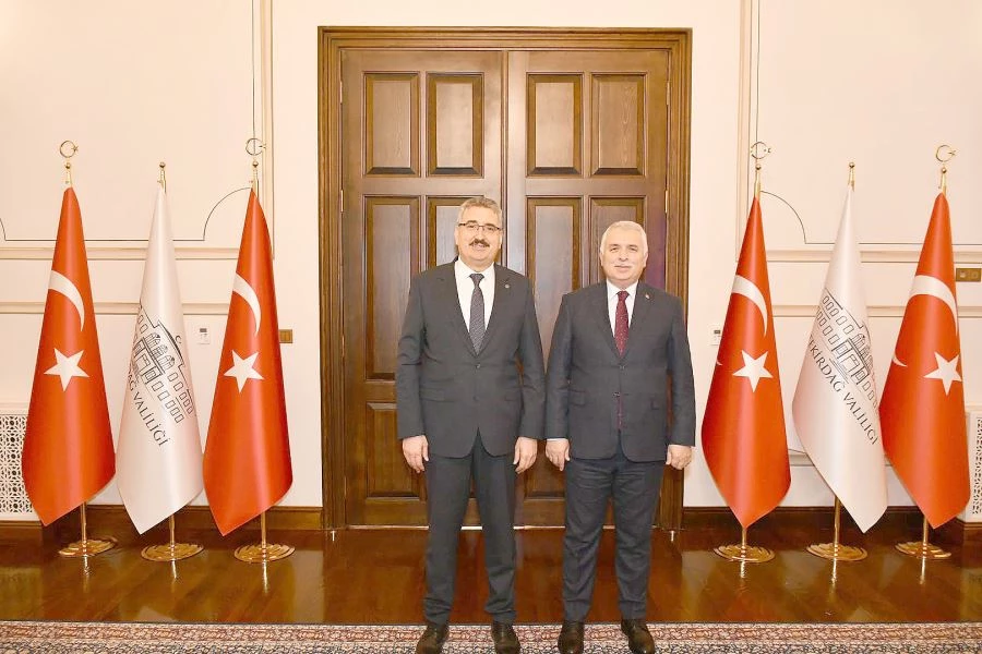 Tekirdağ Valisi Aziz Yıldırım, Cumhurbaşkanı Recep Tayyip Erdoğan’ın imzasıyla yayımlanan atama kararıyla tekrardan Tekirdağ Namık Kemal Üniversitesi (NKÜ) Rektörü olan Prof. Dr. Mümin Şahin’i makamında kabul etti.