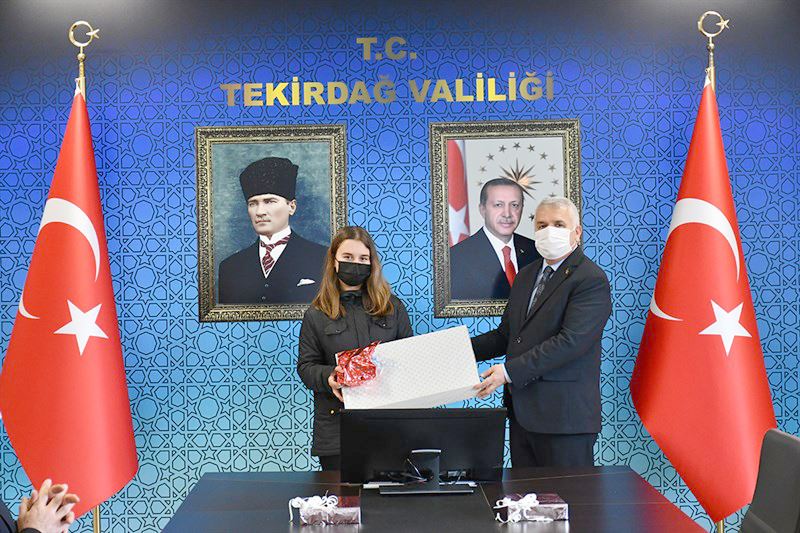 Vali Aziz Yıldırım, düzenlenen yarışmada İlkokul kategorisinde 3. olan Çorlu ilçesi Emlak Konut Ergene Vadisi İlkokulu öğrencisi Uygar Gönüllü’yü, lise kategorisinde 3. olan Süleymanpaşa İlçesi Yahya Kemal Beyatlı Güzel Sanatlar Lisesi öğrencisi Hasan Demirali’yi, ortaokul kategorisinde 1. olan Çorlu ilçesi Furtuni ve İsak Pinhas Ortaokulu öğrencisi Bilge Emir’i ve öğrencilerin ailelerini Valilik Toplantı Salonu’nda kabul etti.