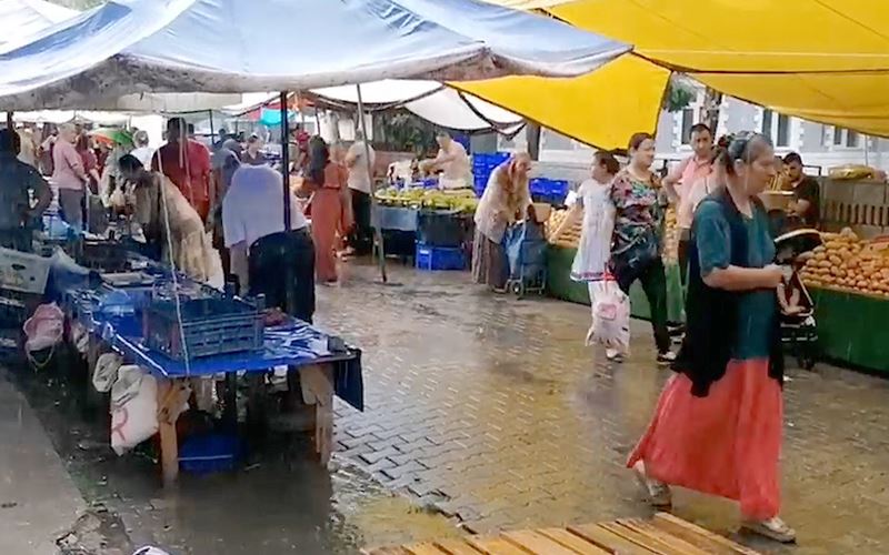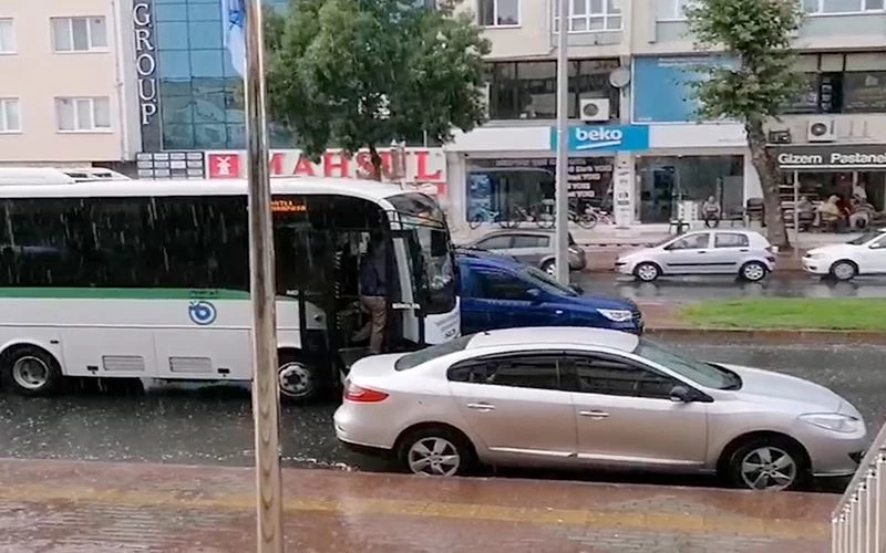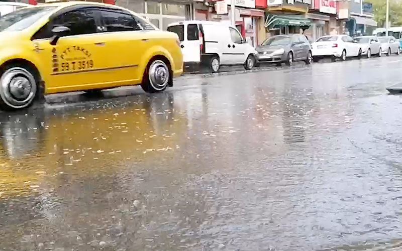 Yoğun yağan yağmur sebebiyle yolda su birikintileri oluştu. Vatandaşlar ise yağmurun durmasının ardından alışverişlerine devam ettiler.
