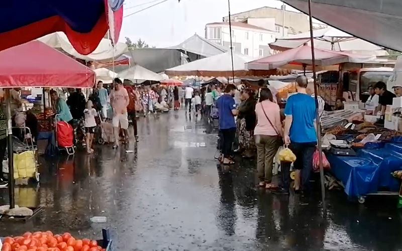 Tekirdağ’ın Muratlı ilçesinde aniden bastıran yağmur hayatı olumsuz etkiledi. Yağmurun şehirde kurulan ilçe pazarıyla aynı güne denk gelmesiyle vatandaşlar ve pazaryeri esnafı zor anlar yaşadı. Bazı vatandaşlar yağmurdan korunmak için çatıların altına sığınırken, bazı vatandaşlar ise pazaryeri esnafının kurduğu branda ve şemsiyelerin altlarında bekledi.