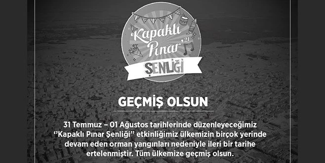 Kapaklı Belediyesi?nden yapılan açıklamada şu ifadelere yer verildi: ?31 Temmuz ? 01 Ağustos tarihlerinde düzenleyeceğimiz ??Kapaklı Pınar Şenliği?? etkinliğimiz ülkemizin birçok yerinde devam eden orman yangınları nedeniyle ileri bir tarihe ertelenmiştir. Tüm ülkemize geçmiş olsun.?