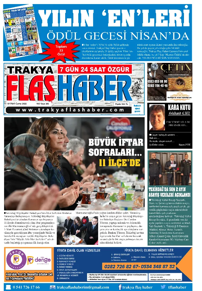 Trakya Flaş Haber Gazetesi’nin, 315. sayısı yine dopdolu! Bu hafta gazetemizin manşetinde, Tekirdağ Büyükşehir Belediyesi’nin Ramazan ayında 11 ilçede düzenleyeceği iftar programları yer alıyor. İlk iftar programı ise Marmaraereğlisi’nde veren Büyükşehir Belediyesi önümüzdeki hafta iftarlara devam edecek. Detaylar gazetenizde…