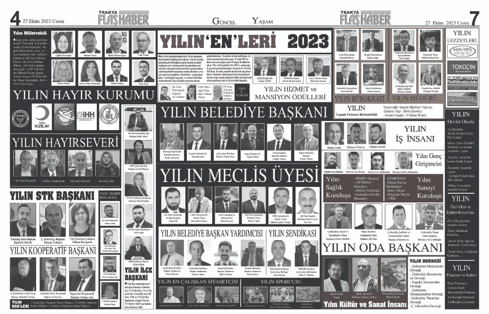 Yılın ikinci yarısında her hafta gazetemizde yayımladığımız, çeşitli kategorilerdeki adaylarımız arasından okurlarımız yıl sonuna kadar tercih yapabilecek. Gazetemizin 1. Sayfasındaki ‘Tercih kuponu’na yazarak, ve en fazla 4 farklı dalda tercihte bulunarak Trakya Flaş Haber gazetesinin adresine gönderebileceksiniz. Ya da elden de teslim edebilirsiniz. Adresimiz gazetenin künyesinde yazmakla birlikte, Gazi Mustafa Kemal Paşa Mahallesi Atatürk Cad. No:6/D:4 Çerkezköy/TEKİRDAĞ, adresine gönderilebilir. 31 Aralık 2023 tarihinde sona erecek projede toplam 30 kategori de ödüllerimiz olacak. Yılın ‘en’leri seçilenleri Ocak 2024’ün ilk haftasında açıklayacağız. En geç mart ayında planlayacağımız bir gecede de ‘en’lerimizin her biri ödülünü alacak.