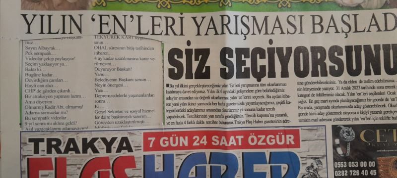 Trakya Flaş Haber gazetesi olarak yıl sonuna kadar her sayımızda yayımlayacağımız, yılın ‘en’leri adayları ve tercih kuponu okurlarımız tarafından yoğun ilgi gördü. Gazetemizin 1. Sayfasındaki tercih kuponunu orta sayfadaki aday listesi ve kategorileri dikkate alınarak doldurulduktan sonra gazetemize gönderen okurlarımız, yılın ‘en’lerini seçmeye başladı. Üç hafta içerisinde 167 oy gazetemize ulaştı. Okurlarımız, tercihlerini yaptıkları kuponları yıl sonuna kadar gazetemize ulaştırabilecek. 30 dalda ödül verilecek yılın ‘en’leri yarışmamız okurlarımızın yoğun ilgisiyle büyük bir heyecan oluşturmayı başardı.