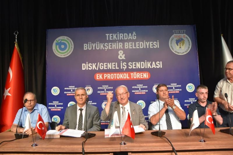 Tekirdağ Büyükşehir Belediyesi ve TESKİ bünyesinde görev yapan daimi işçi ve şirket personellerinin ücretlerinin iyileştirilmesi ile ilgili DİSK Genel-İş Sendikası arasında ek protokol imzalandı. Tekirdağ Büyükşehir Belediyesi Yılmaz İçöz Sahnesi’nde düzenlenen ek protokol töreni sonrasında personel, alınan yüzde 52’lik ek zammı davul zurna ile kutladılar.