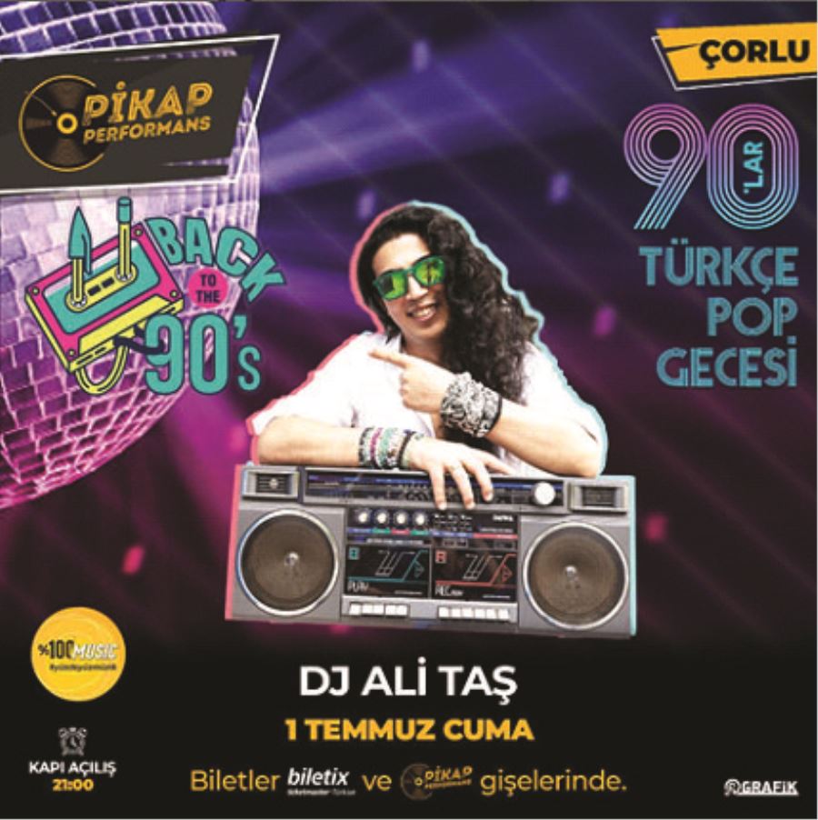 DJ Ali Taş performansı eşliğinde, 90’ların birbirinden güzel şarkılarının kulakların pasını sileceği 90’lar Türkçe Pop Gecesi 1 Temmuz Cuma akşamı Çorlu Pikap Performans Sahne’de.