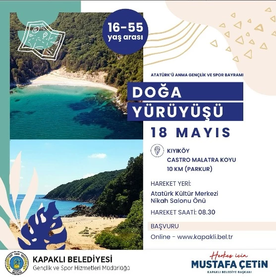 Kapaklı Belediyesi, sakinlerinin mis gibi doğa havası alabilecekleri keyifli bir etkinliğe ev sahipliği yapıyor. 16-55 yaş arasında yer alan kişilerin başvurabileceği doğa yürüyüşü 18 Mayıs Cumartesi günü saat 08.30’da Atatürk Kültür Merkezi Nikâh Salonu önündeki buluşmayla başlıyor. 19 Mayıs Atatürk’ü Anma, Gençlik ve Spor Bayramı kapsamında gerçekleşecek doğa yürüyüşünün rotası ise Kıyıköy Castro Malatra Koyu.