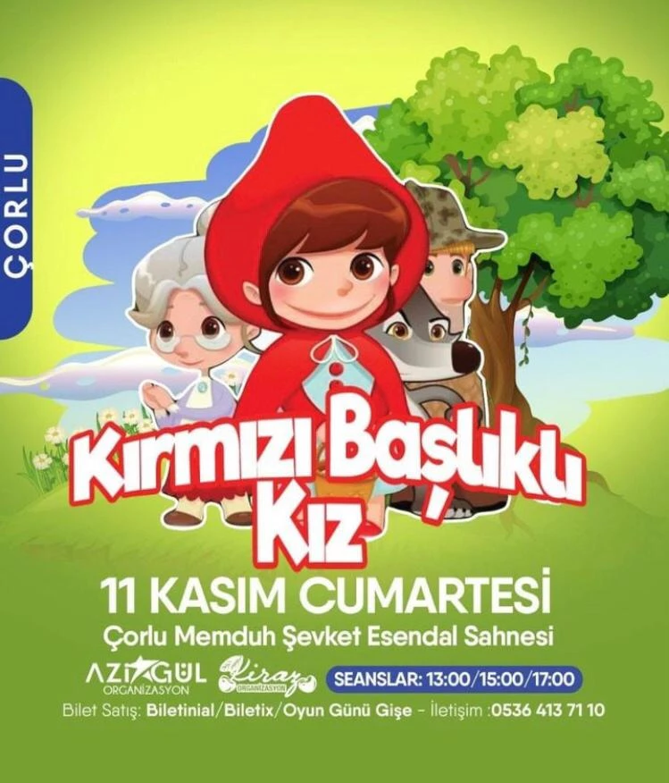 Tüm sevimli sanatseverlerin büyük bir heyecanla izlediği Kırmızı Başlıklı Kız oyunu 11 Kasım Cumartesi günü 13:00, 15:00 ve 17:00 olmak üzere üç ayrı seansla Çorlu Memduh Şevket Esendal Sahnesi’nde minik izleyicileriyle bir araya gelecek.