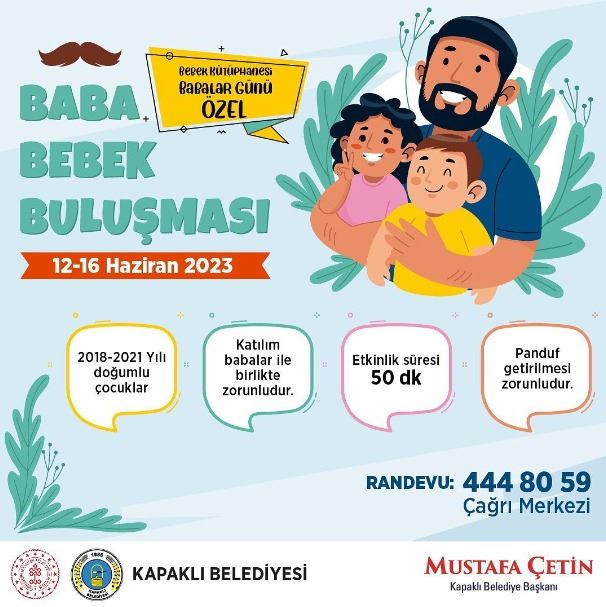 Kapaklı Belediyesi, Babalar Günü’ne özel olarak babaların bebekleriyle keyifli vakit geçirecekleri çok özel bir oluşumu hayata geçiriyor. 12-16 Haziran tarihleri arasında, 2018-2021 yılında doğan bebek ve çocukların katılacağı baba bebek buluşması etkinliğinin süresi ise 50 dakika.