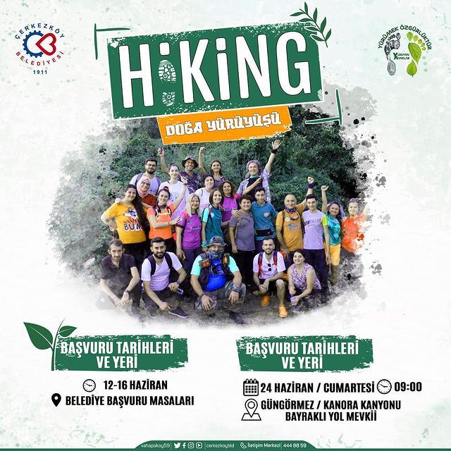 Çerkezköy Belediyesi enfes bir doğa yürüyüşüne ev sahipliği yapıyor. 24 Haziran Cumartesi günü saat 09:00’da Güngörmez – Kanora Kanyonu Bayraklı Yol Mevkii’nde başlayacak olan yürüyüşe gündelik hayatın koşuşturmasından uzaklaşarak yeşilin her tonunu görmek ve keşfetmek isteyen tüm Çerkezköylüler davetli.