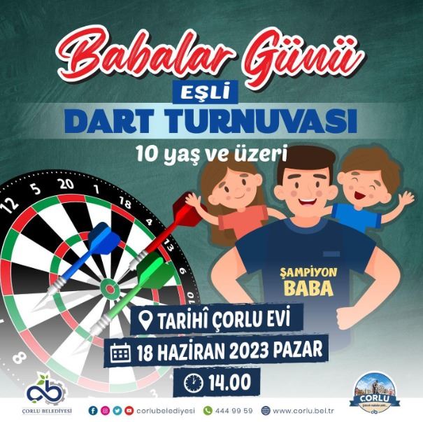 Çorlu Belediyesi kahramanlarımız babalarımız için eğlenceli bir etkinliğe imza atıyor. 10 yaş ve üzeri çocukların babalarıyla beraber katılabilecekleri eşli dart turnuvası 18 Haziran Pazar günü 14:00’te Tarihi Çorlu Evi’nde gerçekleşecek.