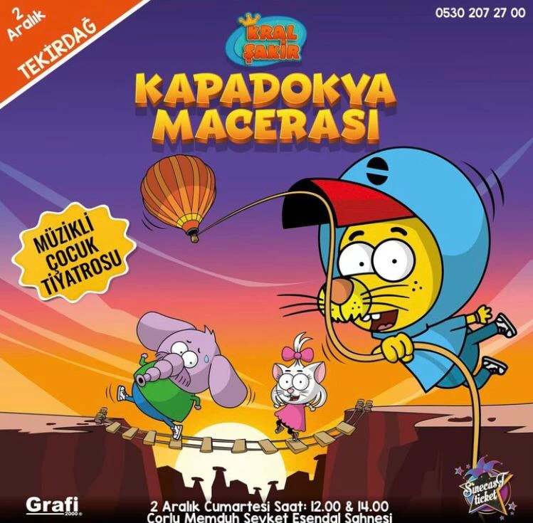 Fenomen karakter Kral Şakir’in Kapadokya seyahatini konu edinen müzikli çocuk tiyatrosu ‘’Kapadokya Macerası’’ 2 Aralık Cumartesi günü 12:00 ve 14:00 seanslarıyla Çorlu Memduh Şevket Esendal Sahnesi’nde perdelerini açacak.