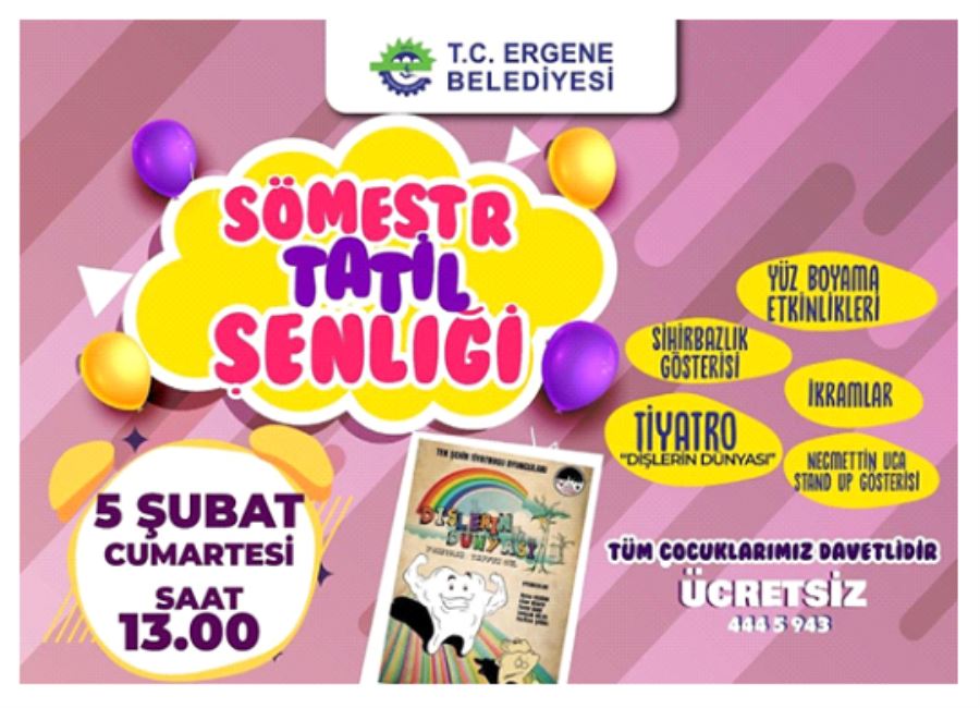5 Şubat Cumartesi günü saat 13:00’te Ergene Belediyesi Kültür Merkezi’nde yüz boyama etkinlikleri, sihirbazlık gösterisi, tiyatro ve Necmettin Uca ile stand up gösterisi çocuklarla ücretsiz olarak buluşacak.