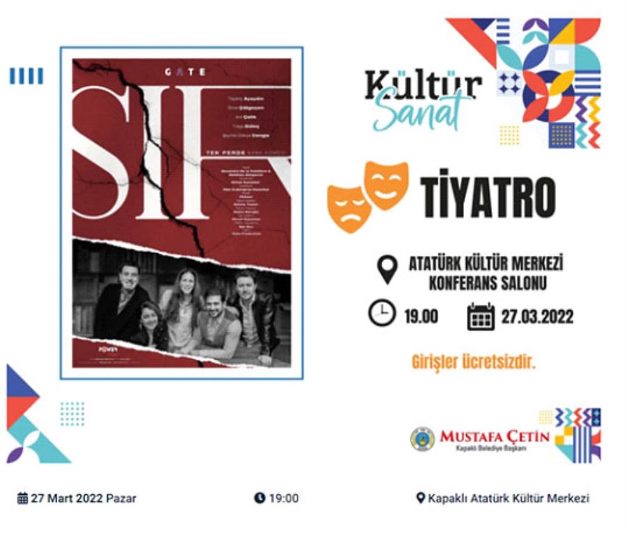 27 Mart Salı günü saat 19.00’da Kapaklı Atatürk Kültür Merkezi’nde ünlü oyuncular Tayanç Ayaydın, Emel Çölgeçen, Anıl Çelik, Tolga Güleç ve Şeyma Gökçe Cengiz’in rol aldığı “Sır” adlı oyun sahnelenecek. Ücretsiz olarak seyirciyle buluşacak oyuna kaliteli vakit geçirmek isteyen tüm izleyiciler davetli. J