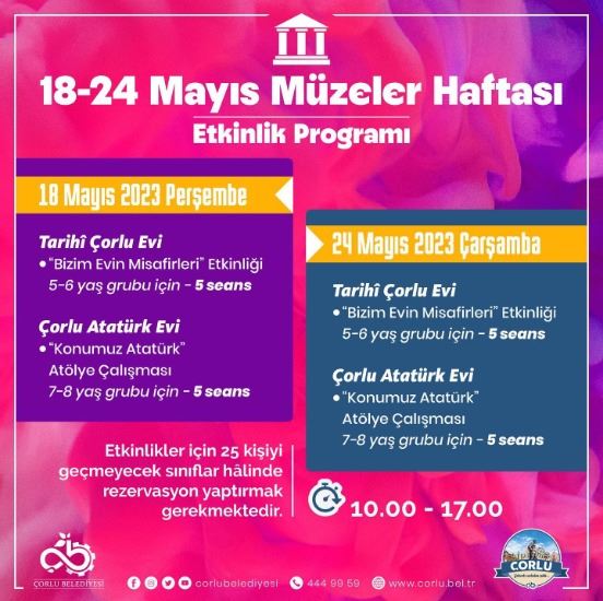 18 Mayıs Perşembe günü 5-6 yaş grubu için Tarihi Çorlu Evi, 7-8 yaş grubu için Çorlu Atatürk Evi ve 24 Mayıs Çarşamba günü 5-6 yaş grubu için Tarihi Çorlu Evi, 7-8 yaş grubu için Çorlu Atatürk Evi’nde etkinlikler düzenleyecek Çorlu Belediyesi, belirtilen tarihlerde belirtilen yaş gruplarındaki çocuklar için ücretsiz atölyeler organize edecek.