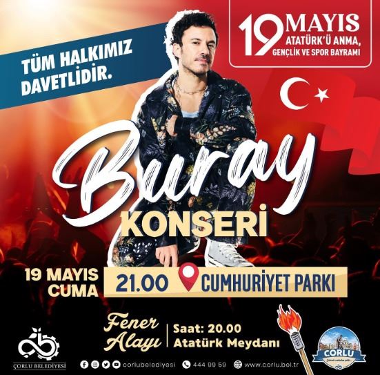 Çorlu Belediyesi, 19 Mayıs Atatürk’ü Anma, Gençlik ve Spor Bayramı kutlamaları kapsamında şarkıcı Buray’ı ağırlıyor.