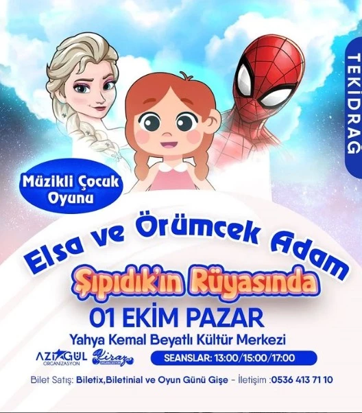 Çocukların en sevdiği çizgi film kahramanlarından olan Elsa ve Örümcek Adam tek bir oyunda sevimli sanatseverlerle buluşuyor. Tüm çocuklar tarafından heyecanla beklenen ve Türkiye turnesine başlayan Elsa ve Örümcek Adam Şıpıdık’ın Rüyasında müzikli çocuk oyunu 1 Ekim Pazar günü 13:00, 15:00 ve 17:00 olmak üzere üç ayrı seansla Tekirdağ Yahya Kemal Beyatlı Kültür Merkezi’nde perdelerini büyük bir coşkuyla açıyor.