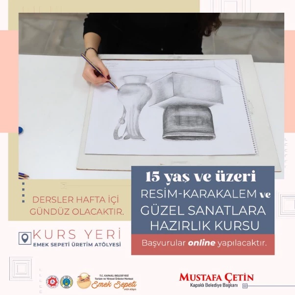 15 yaş ve üzeri Kapaklıların https://www.kapakli.bel.tr/kapakli/formlar/basvuru-formlari/resim-karakalem-ve-guzel-sanatlara-hazirlik-kursu-basvuru-formu adresi üzerinden online olarak başvurabileceği etkinlik Emek Sepeti Üretim Atölyesi’nde gerçekleşecek.