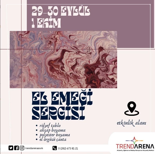 Rölyef tablo, ahşap boyama, polyester boyama ve el örgüsü çanta ürünlerinin meraklılarıyla buluşacağı El Emeği Sergisi 29-30 Eylül ve 1 Ekim tarihlerinde Trend Arena AVM etkinlik alanında yerini alacak.