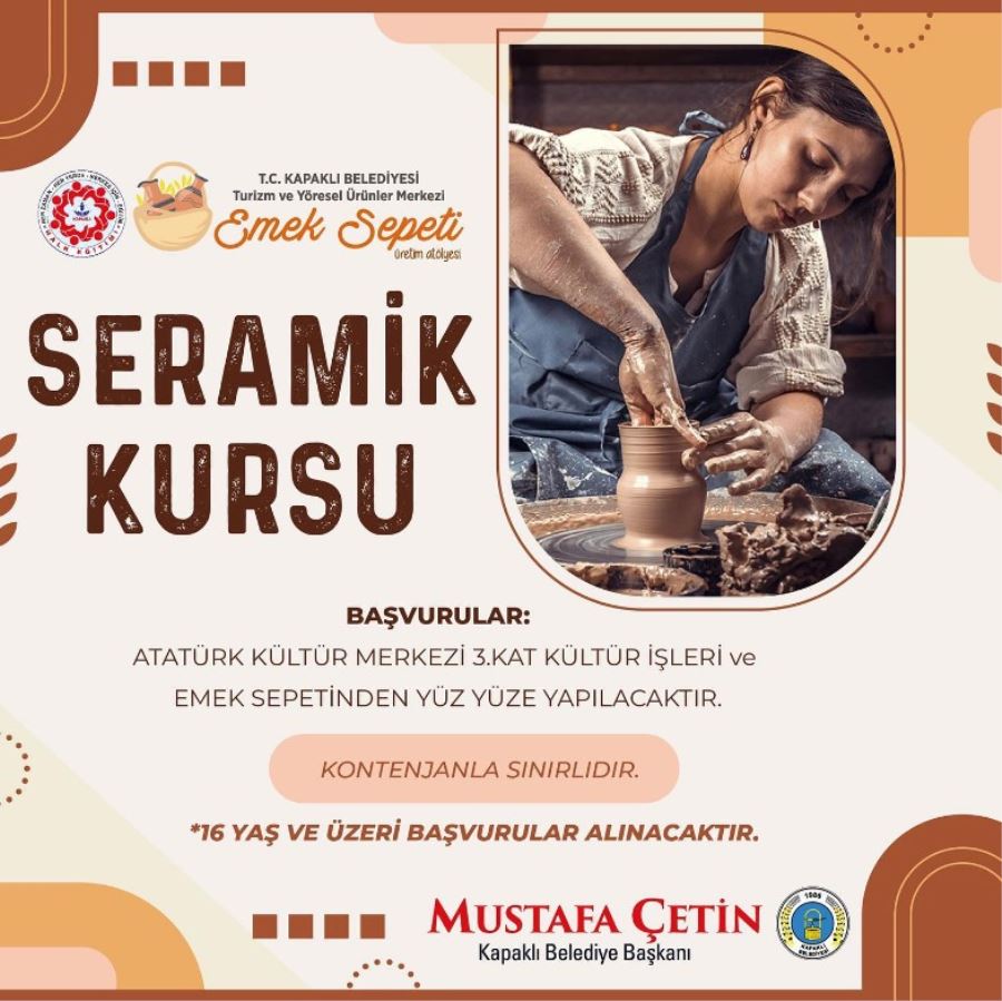 Bu amaçla Kapaklı Belediyesi tarafından düzenlenen seramik atölyesi başvuruları Kapaklı Atatürk Kültür Merkezi ve Emek Sepeti’nden yüz yüze yapılıyor ve kurs sadece 16 yaş üzeri kursiyerleri ağırlıyor.