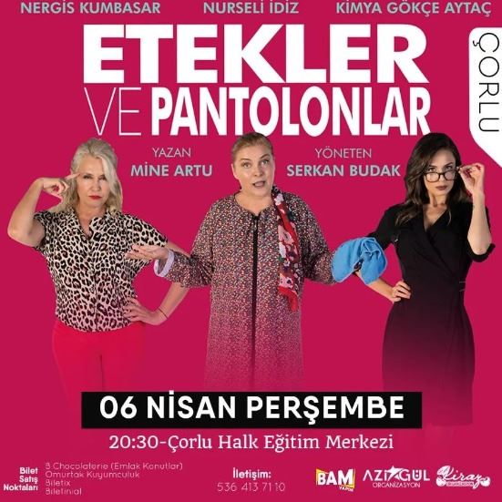 Nurseli İdiz, Nergis Kumbasar ve Kimya Gökçe Aykaç’ı aynı sahnede buluşturan keyifli oyun Etekler ve Pantolonlar 6 Nisan Perşembe akşamı saat 20:30’da Çorlu Halk Eğitim Merkezi’nde izleyicisiyle buluşacak.