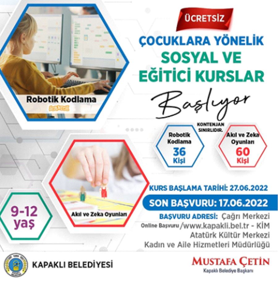 9-12 yaş arasındaki çocuklar için ücretsiz olarak gerçekleşecek ‘’Robotik Kodlama’’ ve ‘’Akıl ve Zeka Oyunları’’ kurslarının son başvuru tarihi 17 Haziran, kursların başlama tarihleri ise 27 Haziran. Kontenjanların sınırlı olduğu bu kurslara kaliteli bir yaz tatili geçirmek isteyen 9-12 yaş arası tüm minikler davetli!