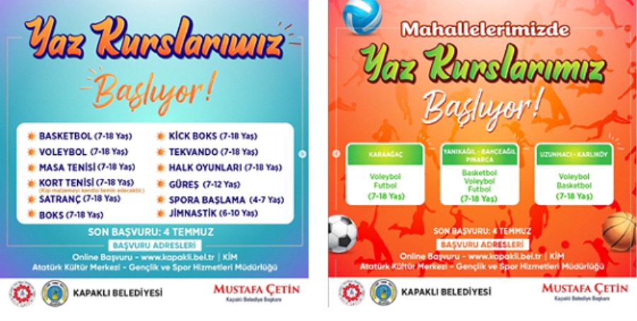 Yaz tatilinde çocuk ve gençlerin sosyal gelişimlerine katkı sağlamayı amaçlayan Kapaklı Belediyesi bu amaçla yaz kursları düzenliyor. Basketbol, voleybol, masa tenisi, satranç, boks, kort tenisi, kick boks, tekvando, halk oyunları, güreş, spora başlama ve jimnastik konularıyla belli yaş aralıklarındaki çocuk ve gençlere sağlanacak kursların son başvuru tarihi ise 4 Temmuz.