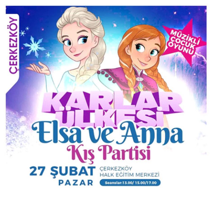 27 Şubat Pazar günü 13:00, 15:00 ve 17:00 olmak üzere üç ayrı seansla Çerkezköy Halk Eğitim Merkezi’nde sahnelenecek olan Karlar Ülkesi Elsa ve Anna Kış Partisi oyunu çocuklara unutulmaz anlar yaşatacak.