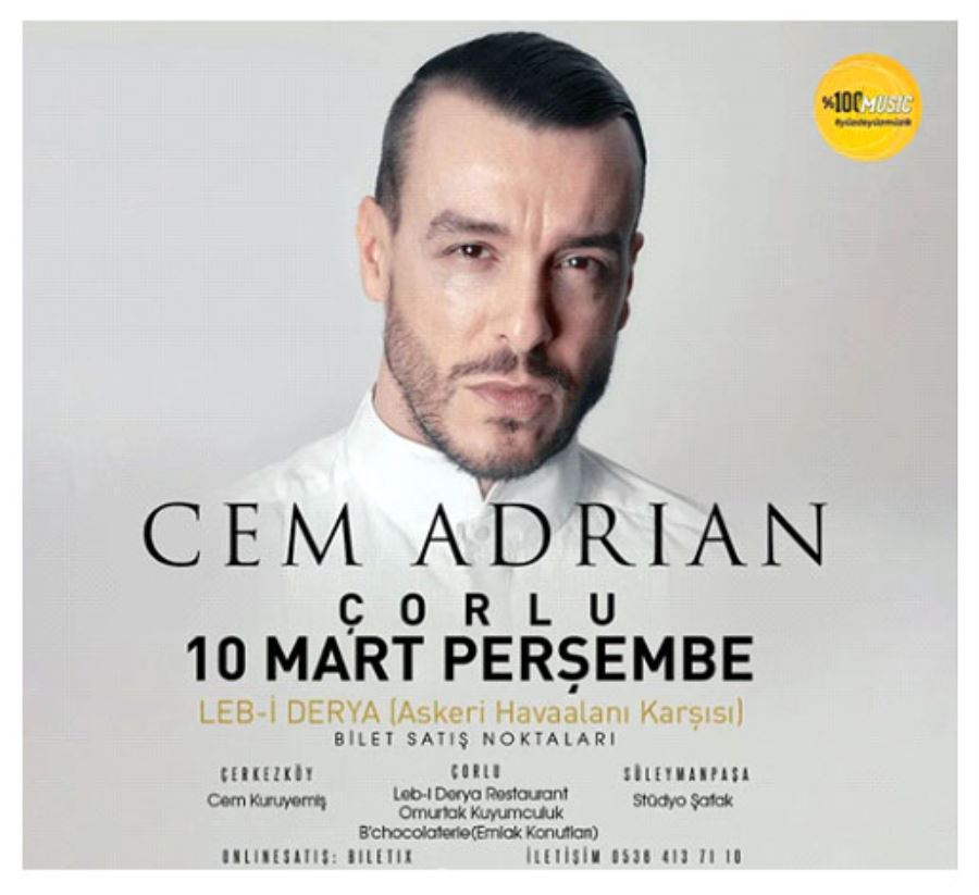 Son dönemde İsrailli kamanca sanatçısı Mark Eliyahu ile birlikte imza attığı ‘’Kül’’ şarkısı ile müzik listelerini alt üst eden Cem Adrian 10 Mart Perşembe günü Çorlu Leb-i Derya sahnesinde sevenlerine müzik ziyafeti vermeye hazırlanıyor.