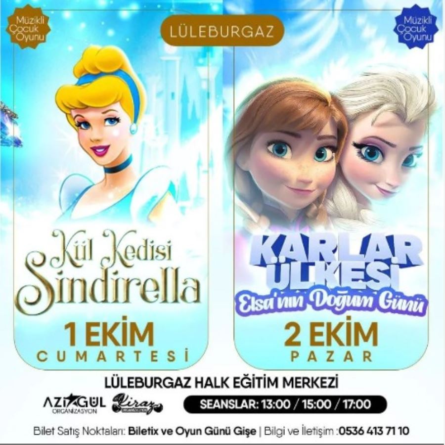 Kül Kedisi Sindirella müzikali 1 Ekim Cumartesi günü, Karlar Ülkesi Elsa’nın Doğum Günü müzikali ise 2 Ekim Pazar Günü Lüleburgaz Halk Eğitim Merkezi’nde izleyicileriyle buluşuyor.