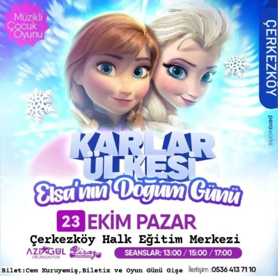 Son yıllarda özellikle minik kızlarımız tarafından çok sevilen ve yakından takip edilen Karlar Ülkesi Elsa, yeni gösterisi Karlar Ülkesi Elsa’nın Doğum Günü müzikli çocuk oyunuyla 13:00, 15:00 ve 17:00 olmak üzere üç ayrı seansla 23 Ekim Pazar Günü Çerkezköy Halk Eğitim Merkezi’nde sevimli izleyicileriyle buluşacak.