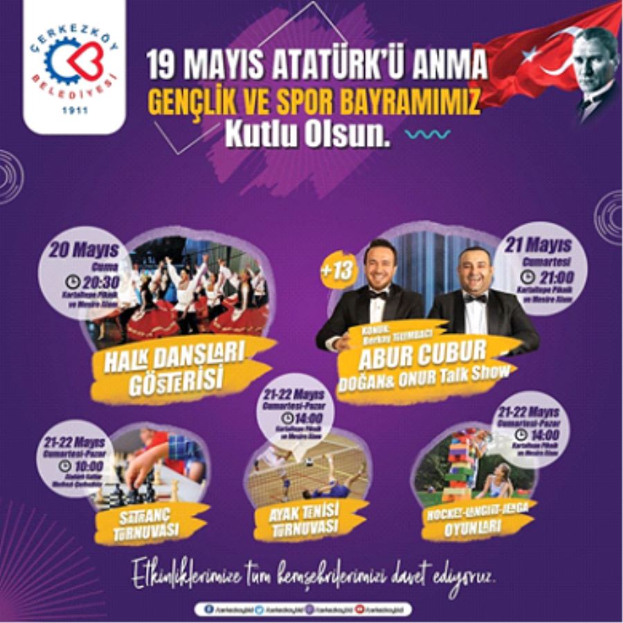 Yarın 19 Mayıs Atatürk’ü Anma, Gençlik ve Spor Bayramı. Ulu Önder Mustafa Kemal Atatürk’ün geleceği emanet ettiği gençlerimize hediye ettiği bayram kapsamında Çerkezköy Belediyesi birbirinden keyifli etkinliklere imza atıyor.