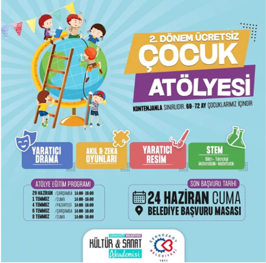 Çerkezköy Belediyesi, yaz tatilinin başlamasıyla beraber çocuklar için 2. dönem ücretsiz Çocuk Atölyesi’ni başlatıyor. Yaratıcı drama, akıl ve zeka oyunları, yaratıcı resim ve stem başlıkları altında 60-72 aylık çocuklar için düzenlenecek atölyeler ücretsiz olup kontenjanla sınırlı. Başvurularınızı 24 Haziran Cuma gününe kadar Çerkezköy Belediyesi Başvuru Masası üzerinden yapabilirsiniz.