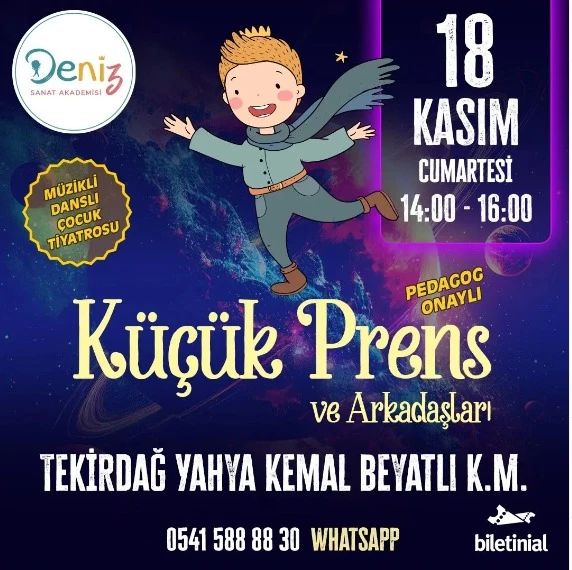 18 Kasım Cumartesi günü 14:00 ve 16:00 seanslarıyla Tekirdağ Yahya Kemal Beyatlı Kültür Merkezi’nde izleyicisiyle buluşacak müzikli danslı çocuk tiyatrosu Küçük Prens ve Arkadaşları, çocuklar için harika bir hafta sonu etkinliği niteliğinde.