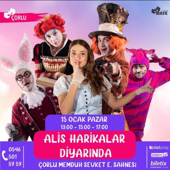 Masal tadında kostümleri ve eğlenceli kurgusuyla Alis Harikalar Diyarında, 15 Ocak Pazar günü 13:00, 15:00 ve 17:00 saatlerinde olmak üzere üç ayrı seansla Çorlu Memduh Şevket Esendal Sahnesi’nde sahnelenecek.