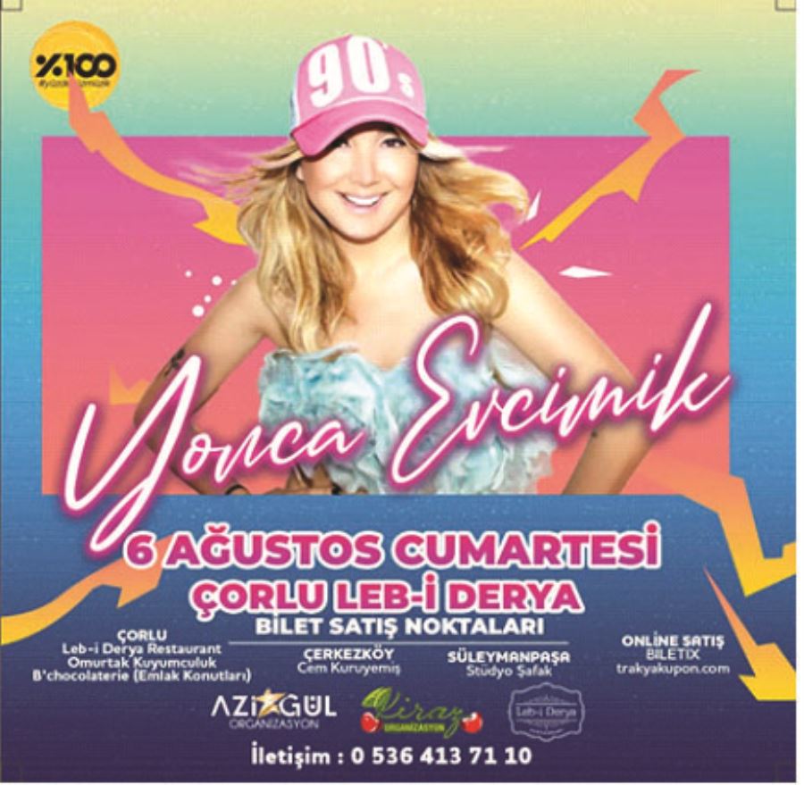 90’lar Türkçe pop müziğine tarzı ve yorumlarıyla farklı bir ses getiren Yonca Evcimik 6 Ağustos Cumartesi akşamı Çorlu Leb-i Derya’da sevenleriyle buluşuyor!