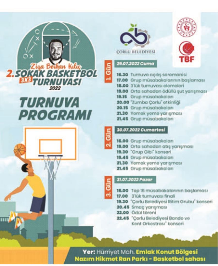 Çorlu Belediyesi Ziya Berhan Kılıç 3x3 Sokak Basketbol Turnuvası için geri sayım başlattı. 29-31 Temmuz tarihleri arasında gerçekleşecek etkinlik bu heyecana ortak olmak isteyen tüm basketbol severleri Çorlu Nazım Hikmet Ran Parkı’nda ağırlamaya hazır!